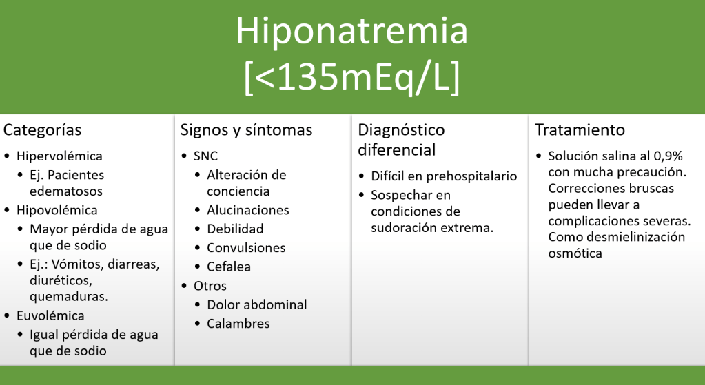 En el ambiente prehospitalario es improbable lograr un diagnóstico certero de hiponatremia, sin embargo, en ciertas condiciones la sospecha es altamente probable. Un ejemplo claro de esto ocurre al atender a personas que han estado bajo un elevado estrés físico y sudoración profusa, por ejemplo, en deportes de largo aliento, como una Maratón.