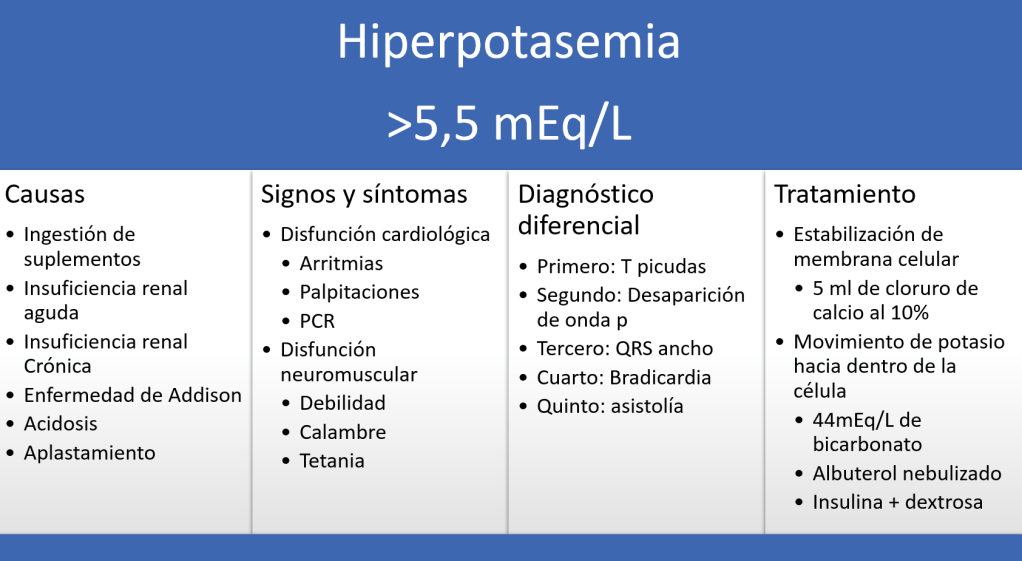 La hiperpotasemia se define como un aumento de potasio en el plasma sanguíneo en valores superiores a 5,5 mEq/L. Las causas más comunes son la ingestión de suplementos y la insuficiencia renal crónica y aguda. Otras causas son la insuficiencia suprarrenal crónica (enfermedad de Addison), la acidosis y las patologías traumáticas por aplastamiento, esta última debido a la ruptura muscular que libera grandes cantidades de potasio intracelular al medio intravascular.