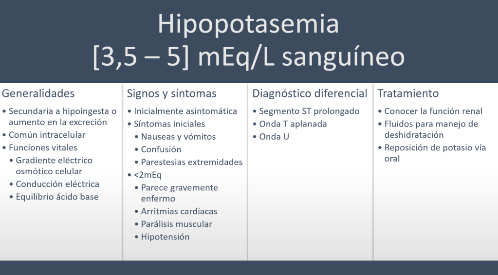 La hipopotasemia inicialmente se presenta asintomática y la sintomatología empeora en la medida que bajan las concentraciones de potasio plasmático.