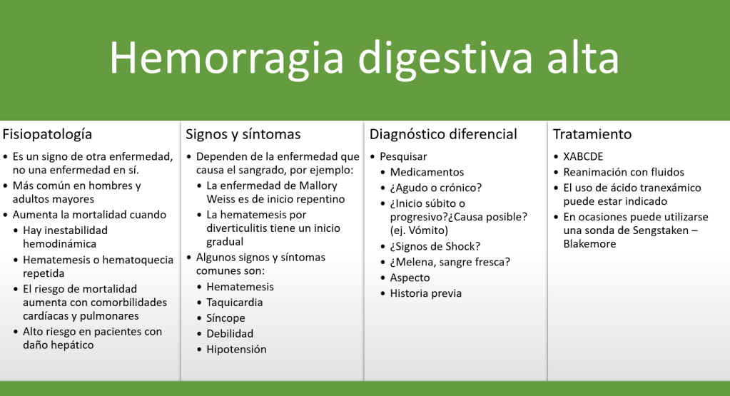 El sangrado gastrointestinal es un cuadro clínico común en urgencias hospitalarias y prehospitalarias y en algunas ocasiones puede comprometer la vida del paciente.