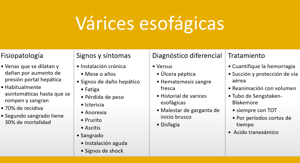 Mayoritariamente las várices esofágicas son asintomáticas, sin embargo cuando sangran suelen generar hematemesis abundante y recidivar en un 70% de los casos. La mortalidad aumenta en la medida que el cuadro se repite a lo largo de la vida, así el segundo sangrado suele tener un 30% de mortalidad.