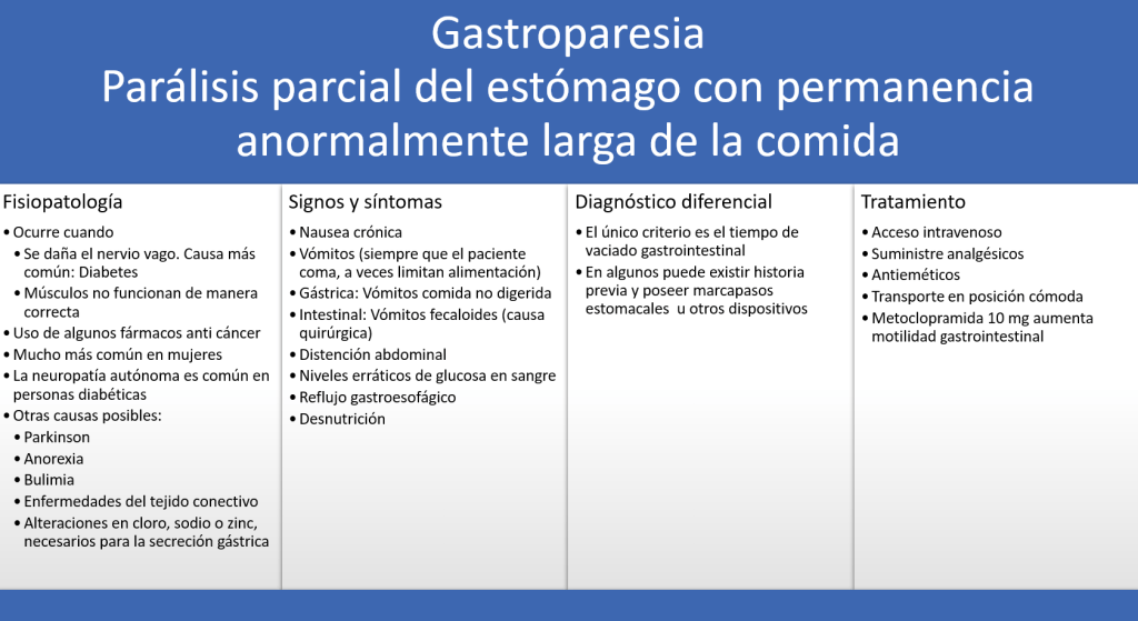 La gastroparesia consiste en una disminución de la motilidad y del tránsito gastrointestinal. Ocurre al dañarse el nervio vago, que es el principal aferente y eferente del sistema nervioso parasimpático, lo que disminuye en control central del sistema gastrointestinal. La causa más común de neuropatía del nervio vago es la diabetes.