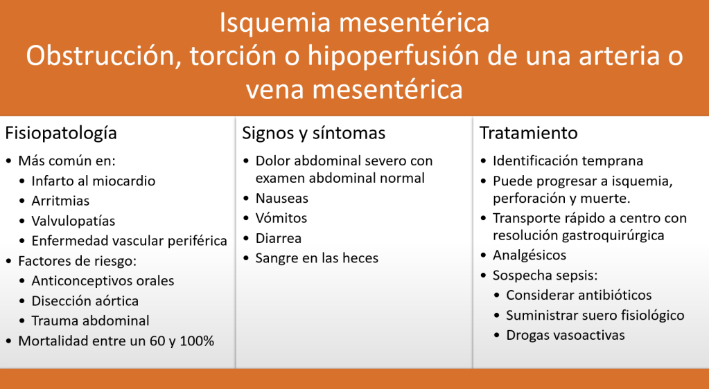 Los factores de riesgo de sufrir una isquemia mesentérica son habitualmente de origen cardiovascular, por lo que para lograr un diagnóstico diferencial lo más certero posible en el ámbito prehospitalario es fundamental realizar una adecuada anamnesis.