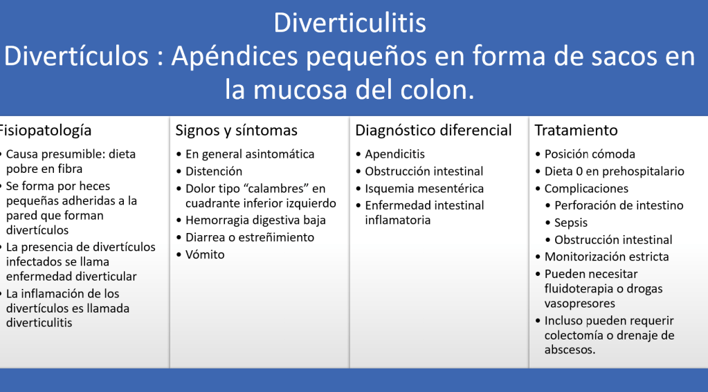 Cuando la diverticulitis se presenta complicada con sepsis, absceso, peritonitis u obstrucción intestinal, el dolor será descrito como insoportable e incontrolable. En este caso el paciente debe ser trasladados a un hospital con resolución gastroquirúrgica.