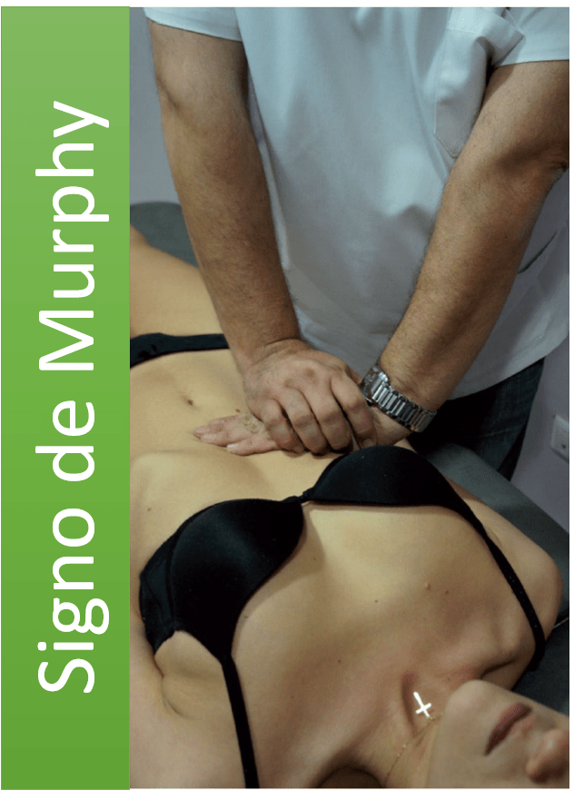 Un signo característico es el de Murphy. Para evaluar este signo el evaluador se dispondrá al costado derecho del paciente, quien estará en decúbito supino y solicitará al evaluado que inspire profundo mientras comprime por debajo del reborde costal derecho en dirección a la camilla. El test es positivo cuando el paciente retira su cuerpo al dolor agudo que produce la maniobra. La sensibilidad de esta prueba oscila entre un 50 y 65% y la especificidad fluctúa entre un 87 y 98% para el diagnóstico de colecistitis. Es importante destacar que la prueba cuenta con valor predictivo negativo de un 98%.