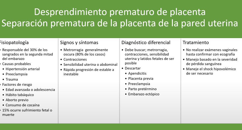 El desprendimiento de placenta consiste en una separación prematura de la placenta de la pared uterina. Es una de las principales complicaciones del embarazo, siendo responsable de cerca del 30% de las metrorragias de la segunda mitad del embarazo.