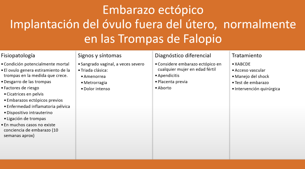 El embarazo ectópico es el resultado de la implantación del embrión en las trompas de Falopio en lugar del endometrio. Infecciones o cicatrices previas evitan el libre transito del blastocito a través de las trompas lo que predispone la ocurrencia de esta condición patológica. En embarazos bien controlados es posible diagnosticar y corregir antes que genere complicaciones, en otros casos el crecimiento del embrión en las trompas de Falopio no es viable poniendo en riesgo la vida de la madre. En algunos casos las complicaciones pueden suceder dentro de las 10 primeras, cuando la paciente aun no sabe que está embarazada.