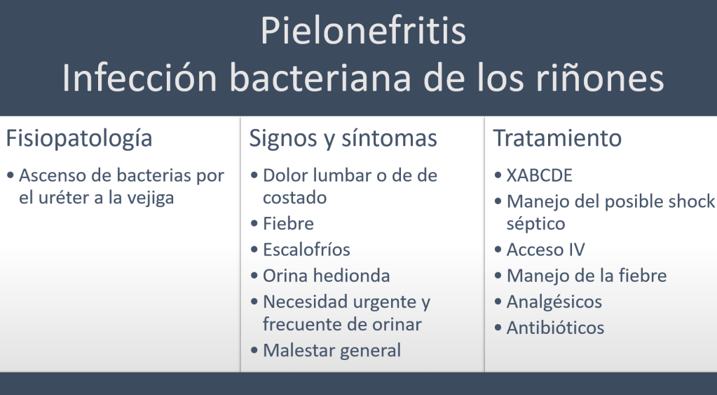 La pielonefritis es un cuadro caracterizado por dolor lumbar, fiebre y escalofríos presumiblemente por causa infecciosa bacteriana de los riñones, proveniente del tracto urinario.